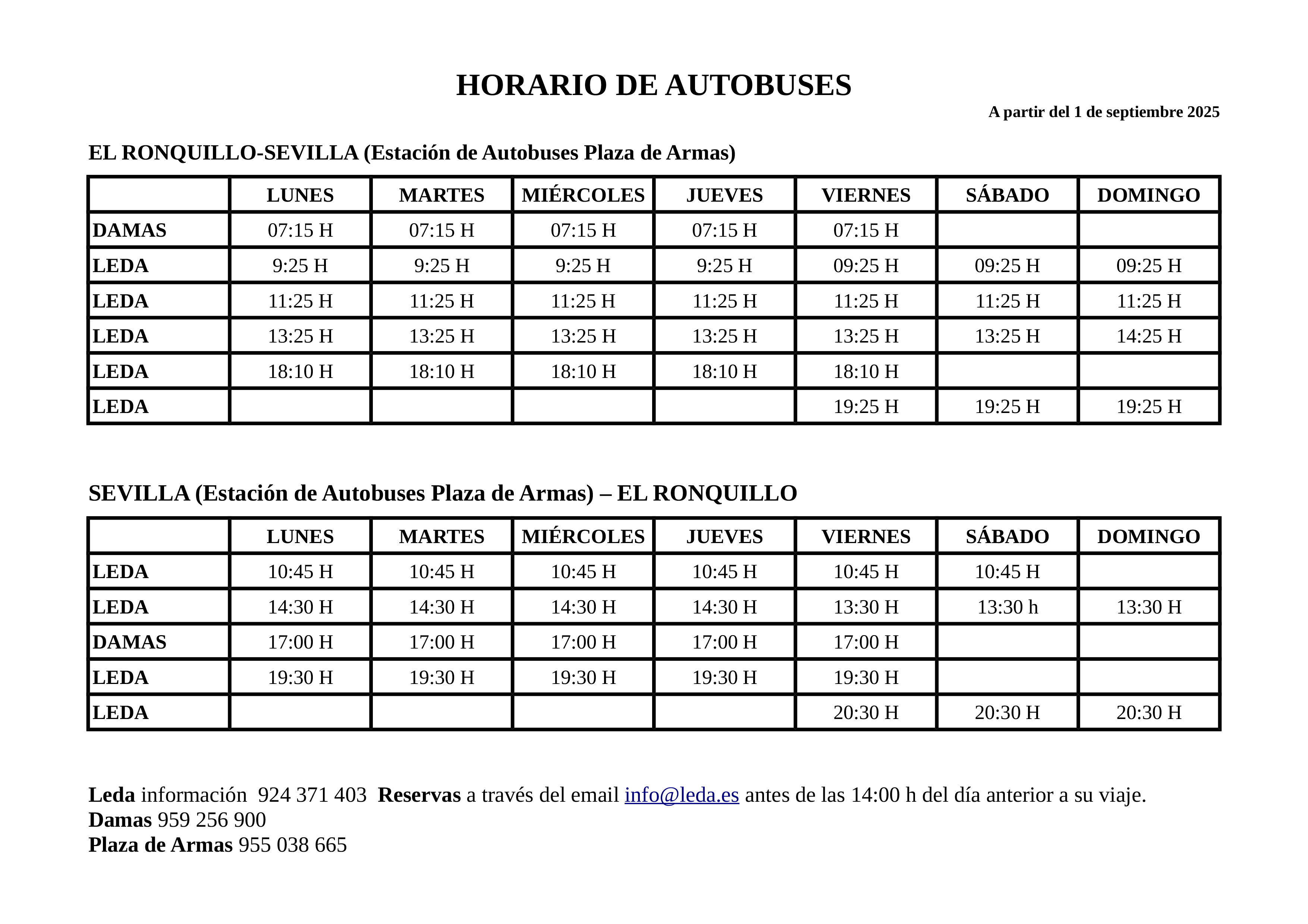 Leda. 954371403. www.leda.es Reservas a través del email info@leda.es antes de las 14:00 h del día anterior a su viaje.