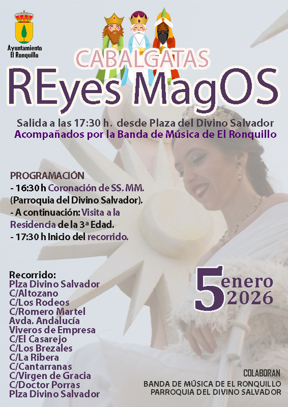 - 16:30 h Coronación de SS. MM. Los Reyes Magos de Oriente en la Parroquia del Divino Salvador.