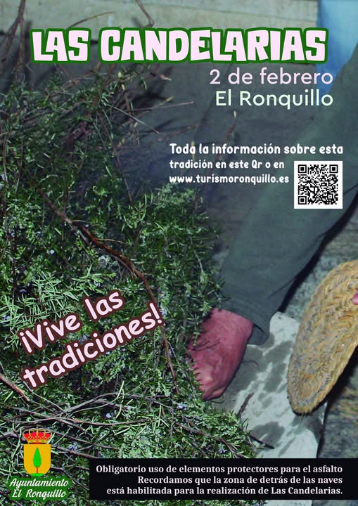 El 2 de febrero es tradición en El Ronquillo celebrar La Candelaria prendiendo candelas de monte y romero en las calles del pueblo, se trata de una antigua tradición de nuestro municipio, que se mantiene muy arraigada, aunque en los últimos años es celebrada por muchos de los vecinos y vecinas el sábado más cercano a esta fecha, LA MAYORÍA DE LAS CANDELAS SERÁN PRENDIDAS EL SÁBADO 1 DE FEBRERO.