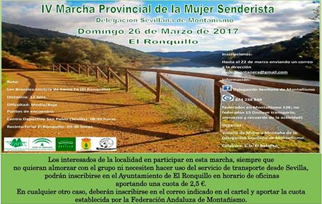 -Con transporte desde Sevilla hasta El Ronquillo y almuerzo tras ruta: Precio 12 € para Federados en Montañismo y 15€ para No federados. Inscripciones en mujermontañera@gmail.com hasta el 22 de marzo.