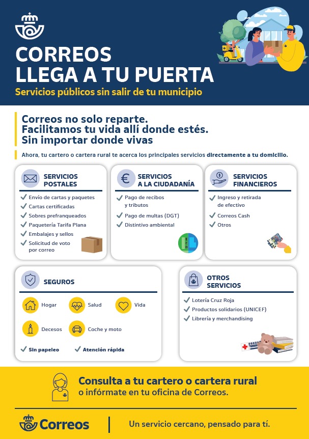 - Gestiones financieras como el servicio Correos Cash, que permite ingresar y retirar efectivo tanto en oficinas como a través de carteros y carteras rurales, e incluso solicitar la entrega de dinero a domicilio.