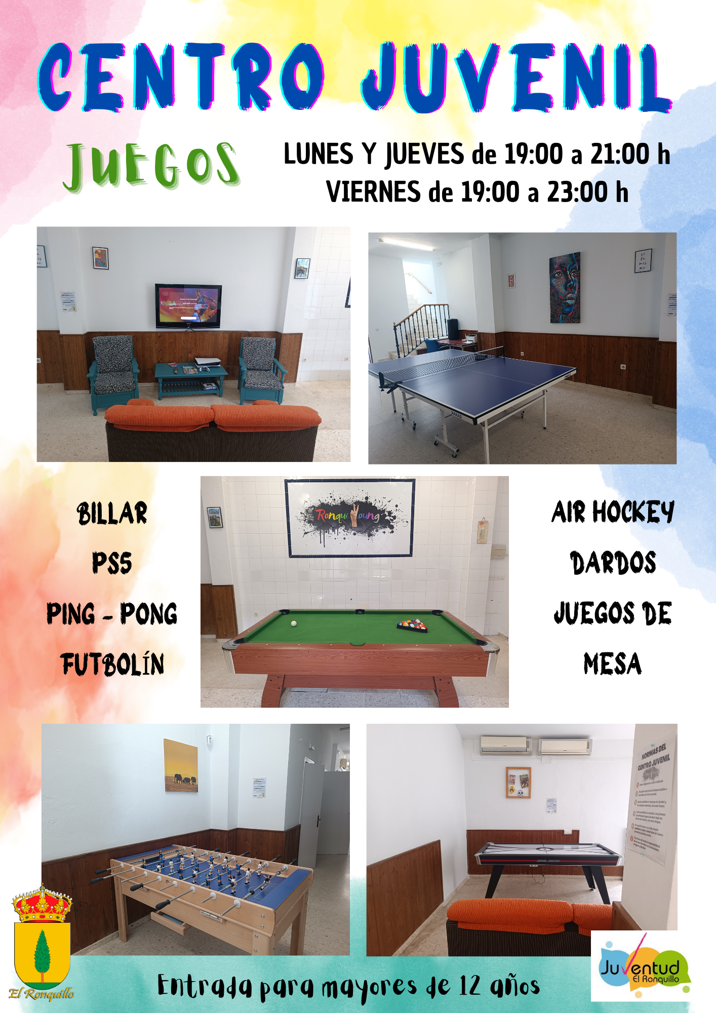El Centro Juvenil abre sus puertas lunes, jueves y viernes por la tarde para que disfrutes jugando con tus amigos/as al billar, al ping-pong, a la PS5, al futbolín, al Air-hokey, a los dardos, a juegos de mesa, ...