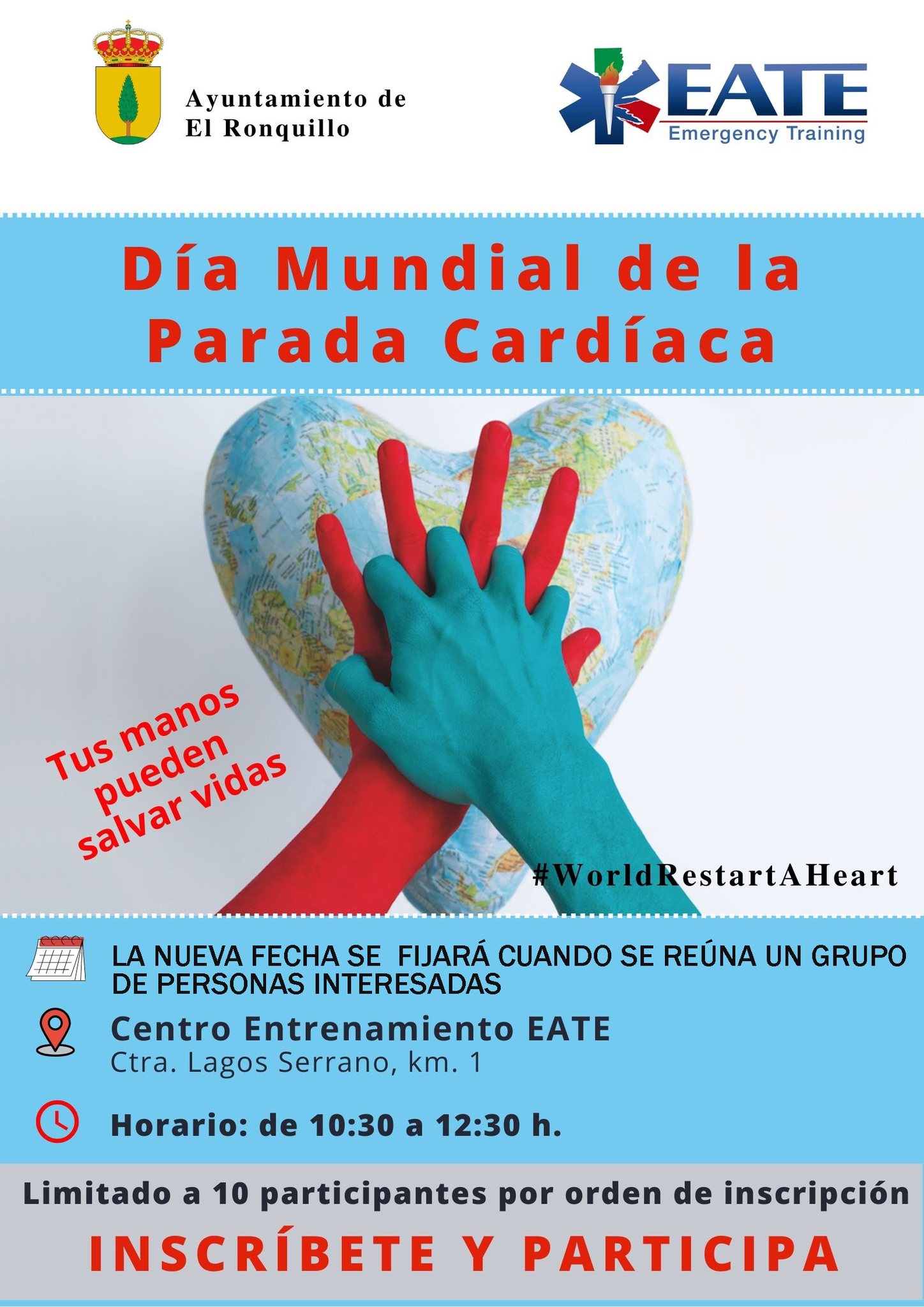 El Ayuntamiento informa que la fecha del TALLER DE REANIMACIÓN CARDIOPULMONAR impartido por EATE, con motivo del Día Internacional de la Parada Cardíaca, se ha aplazado por falta de inscripciones y se fijará la nueva fecha cuando se reúna el grupo de personas interesadas.