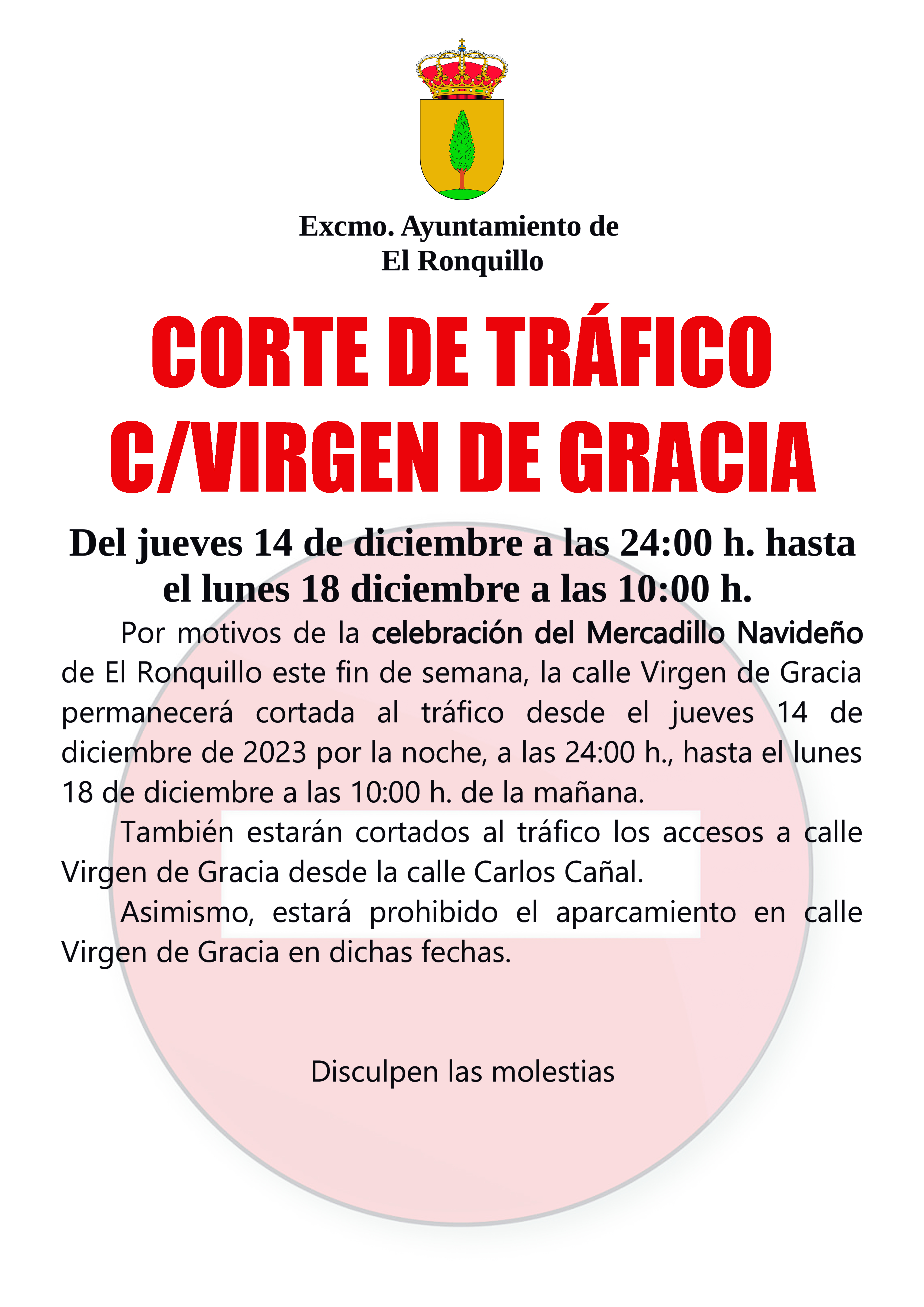 Por motivos de la celebración del Mercadillo Navideño de El Ronquillo este fin de semana, la calle Virgen de Gracia permanecerá cortada al tráfico desde el jueves 14 de diciembre de 2023 por la noche, a las 24:00 h., hasta el lunes 18 de diciembre a las 10:00 h. de la mañana.