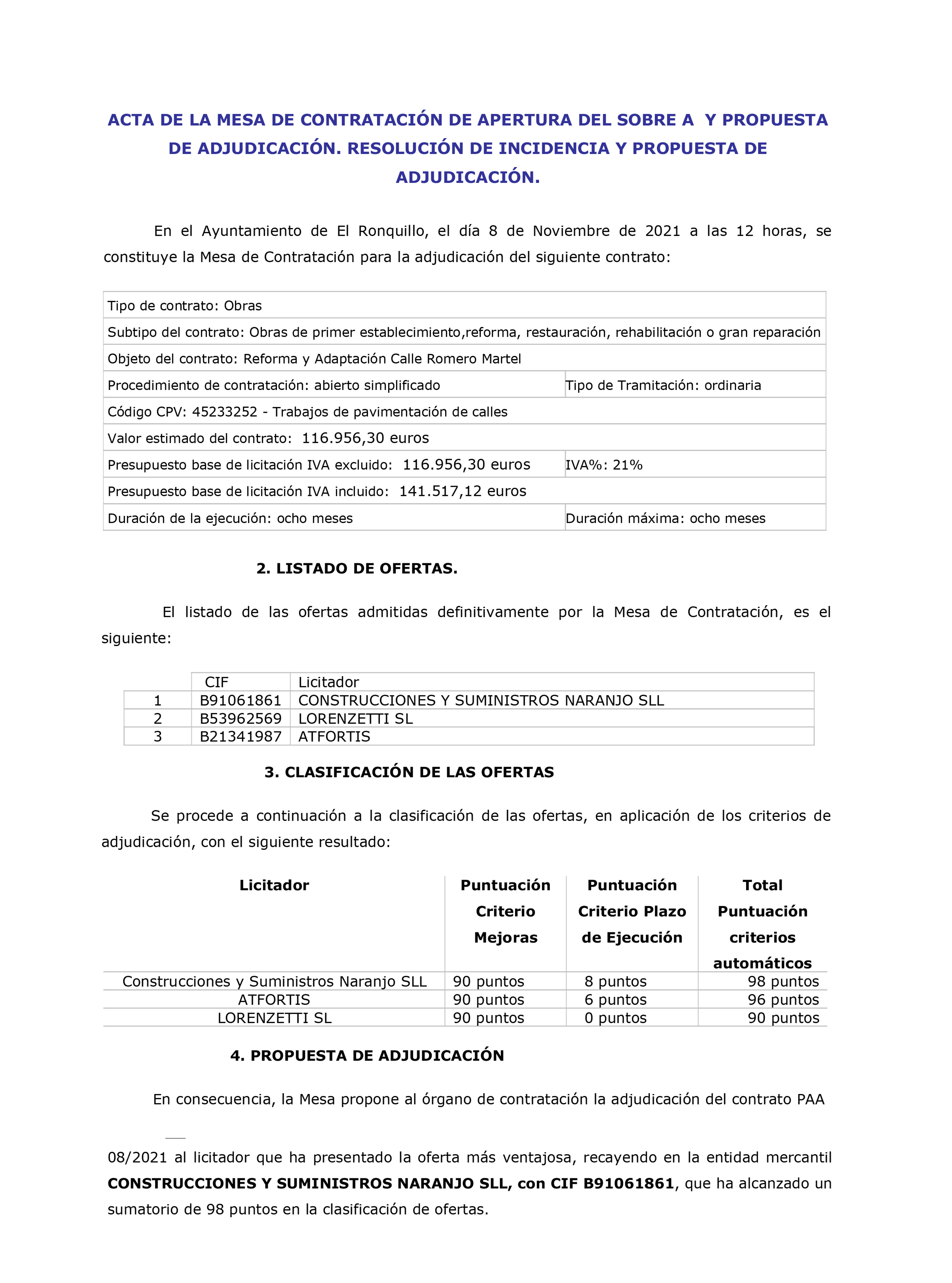 El Ayuntamiento ha adjudicado definitivamente las Obras “REFORMA Y ADAPTACIÓN DE CALLE ROMERO MARTEL” Publicamos imagen del Acta donde se pueden ver las empresas presentadas a esta licitación y la puntuación obtenida por cada una de ellas.