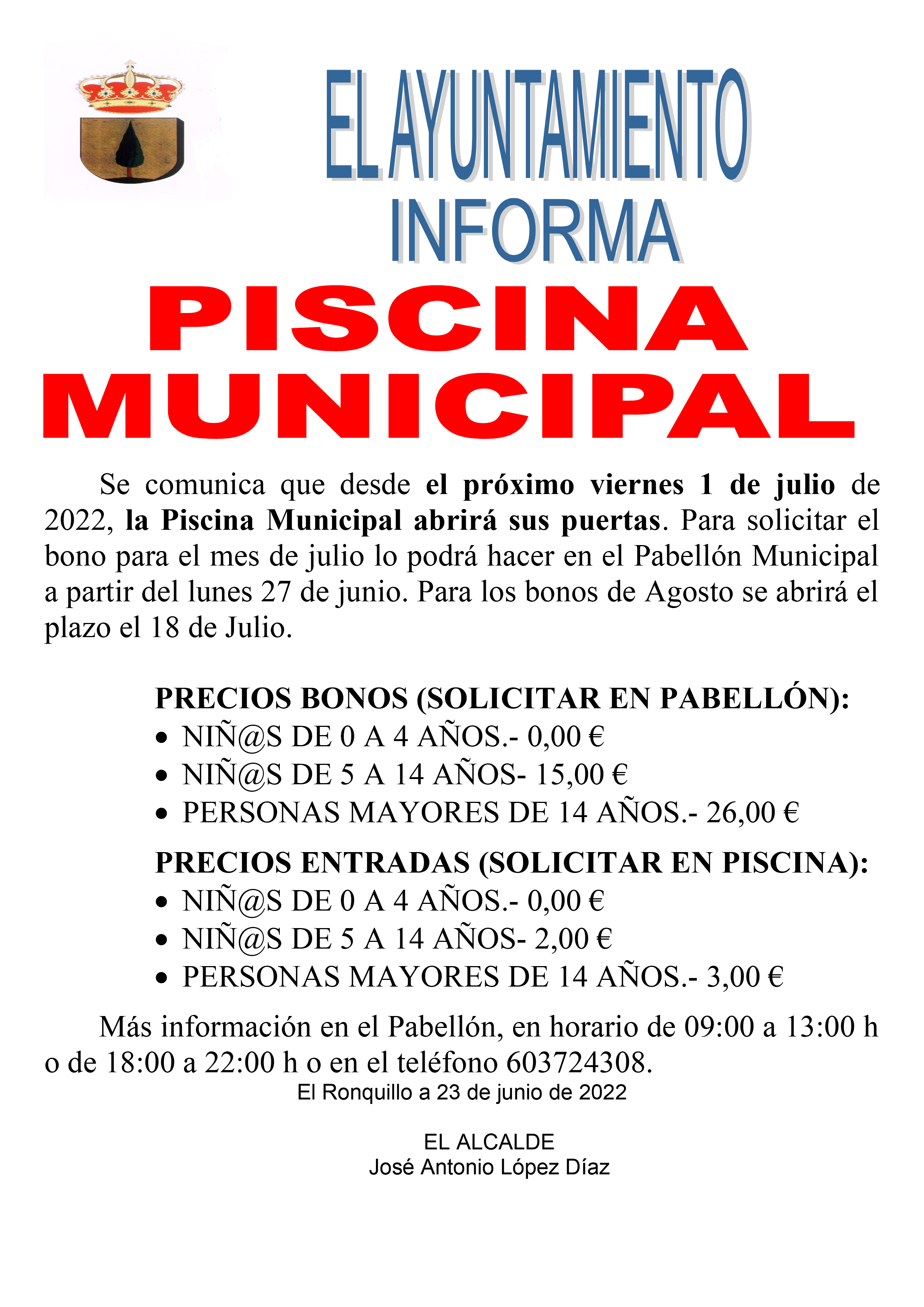 Se comunica que desde el próximo viernes 1 de julio de 2022, la Piscina Municipal abrirá sus puertas. Para solicitar el bono para el mes de julio lo podrá hacer en el Pabellón Municipal a partir del lunes 27 de junio. Para los bonos de Agosto se abrirá el plazo el 18 de Julio.