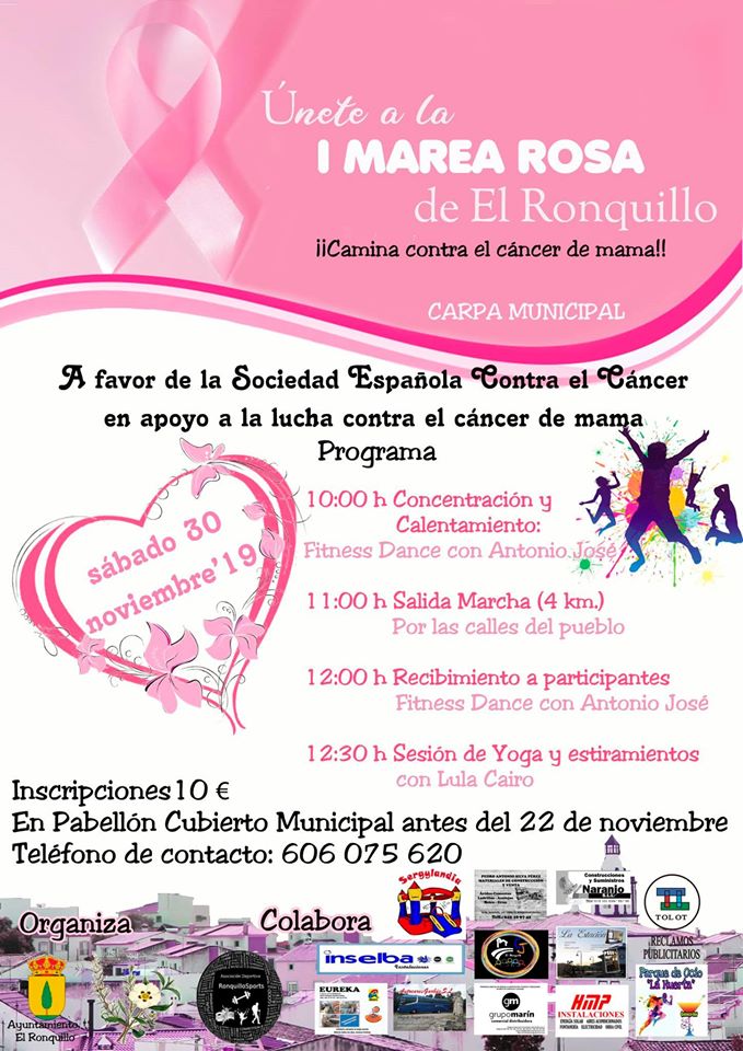 Informamos a todas las personas inscritas en la I Marea Rosa de El Ronquillo que podrán recoger la bolsa de la Marcha, junto a sus camisetas solidarias mañana VIERNES 29 de noviembre en PABELLÓN MUNICIPAL de 10:00 h a 13:00 h y de 17:00 h a 21:00 h.