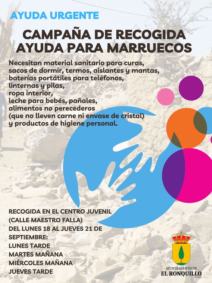 El Ayuntamiento ha habilitado un punto de recogida en el Centro Juvenil para que todos/as los/as ronquilleros/as solidarios/asque quieran colaborar puedan donar mantas, ropa de abrigo, tiendas de campaña, sacos de dormir, material sanitario para curas, alimentos no perecederos, leche para bebés, pañales,... Estará disponible del 18 al 21 de septiembre.