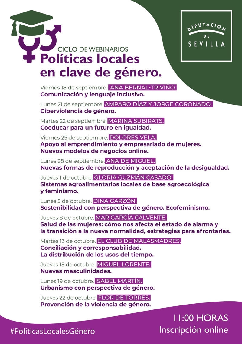 Diputación Provincial de Sevilla ha organizado este ciclo de conferencias telemáticas y participativas, diseñado para abordar distintas temáticas de interés para la recuperación social y económica desde una perspectiva de género, que se desarrollarán desde el 18 de septiembre hasta el 22 de octubre 2020.