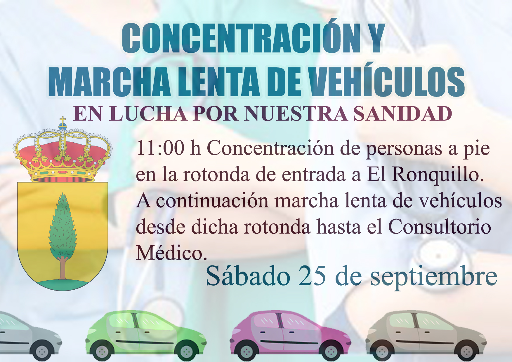 El Ayuntamiento de El Ronquillo, junto a la Plataforma Ciudadana en lucha por nuestra sanidad, CONVOCAN UNA CONCENTRACIÓN Y UNA MARCHA LENTA DE VEHÍCULOS ESTE SÁBADO, 25 DE SEPTIEMBRE, A LAS 11:00 H PARA REIVINDICAR LA REINSTAURACIÓN DEL SERVICIO MÉDICO DE URGENCIAS EN EL RONQUILLO Y DE LA ATENCIÓN MÉDICA EN HORARIO DE 8 A 3.