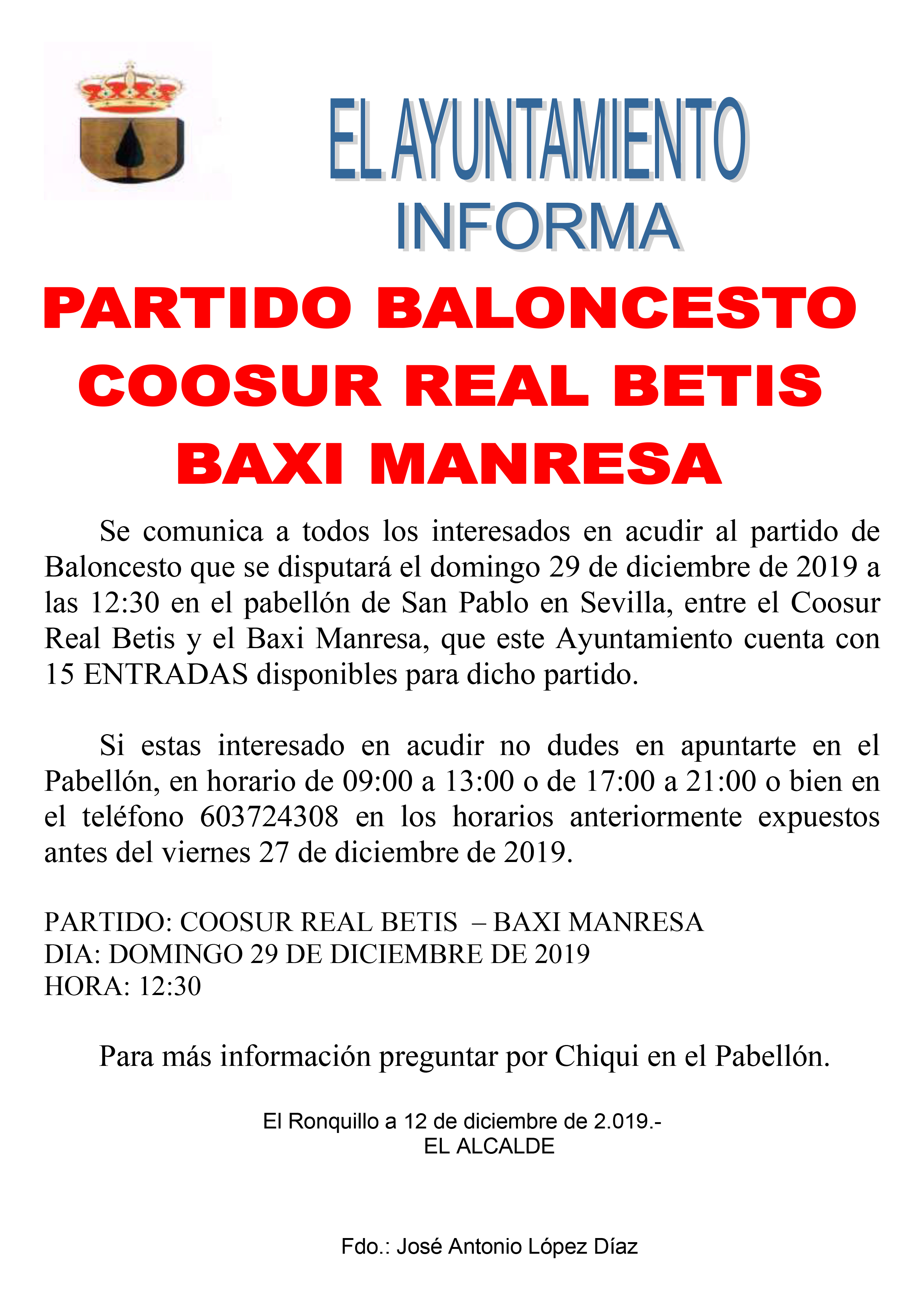 Se comunica a todos los interesados en acudir al partido de Baloncesto que se disputará el domingo 29 de diciembre de 2019 a las 12:30 en el pabellón de San Pablo en Sevilla, entre el Coosur Real Betis y el Baxi Manresa, que este Ayuntamiento cuenta con 15 ENTRADAS disponibles para dicho partido.