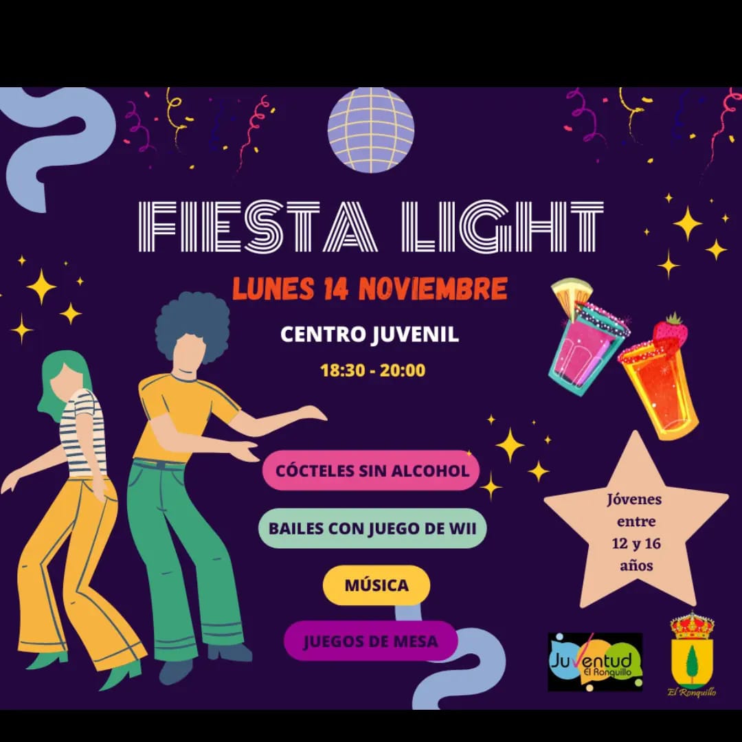 - FIESTA LIGHT.cócteles sin alcohol, juegos de mesa, bailes y música, para disfrutar sin necesidad de consumir alcohol. En el Centro juvenil de 18:30 a 20:00 h.