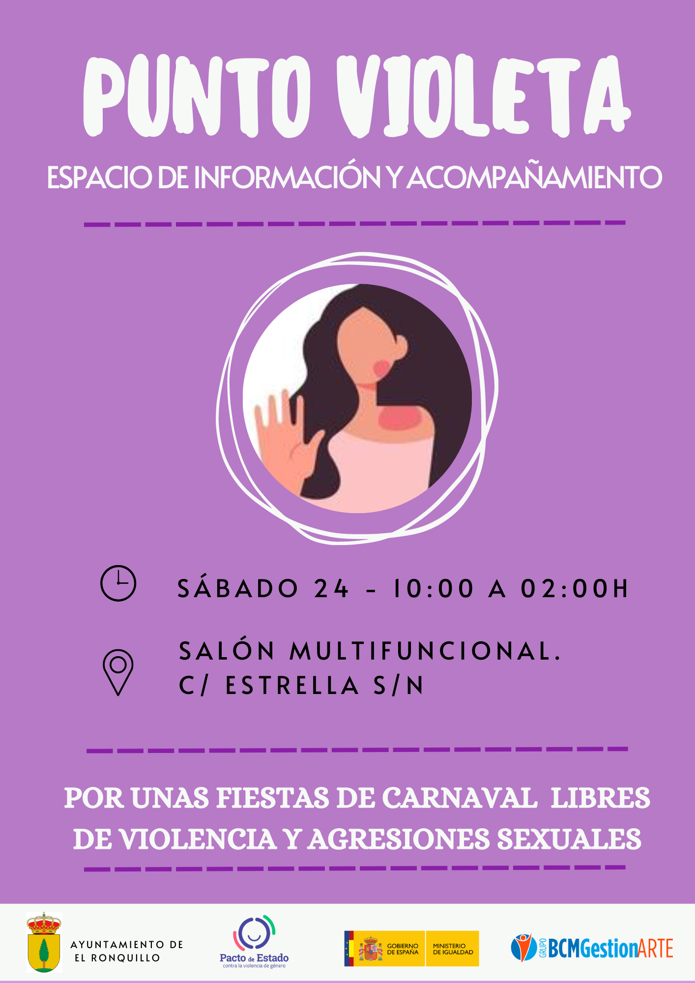 Durante el sábado de Çarnaval, 24 de febrero, de 22.00 a 02.00 h , El Ronquillo contará con un Punto Violeta que se situará próximo al Salón Multifuncional.