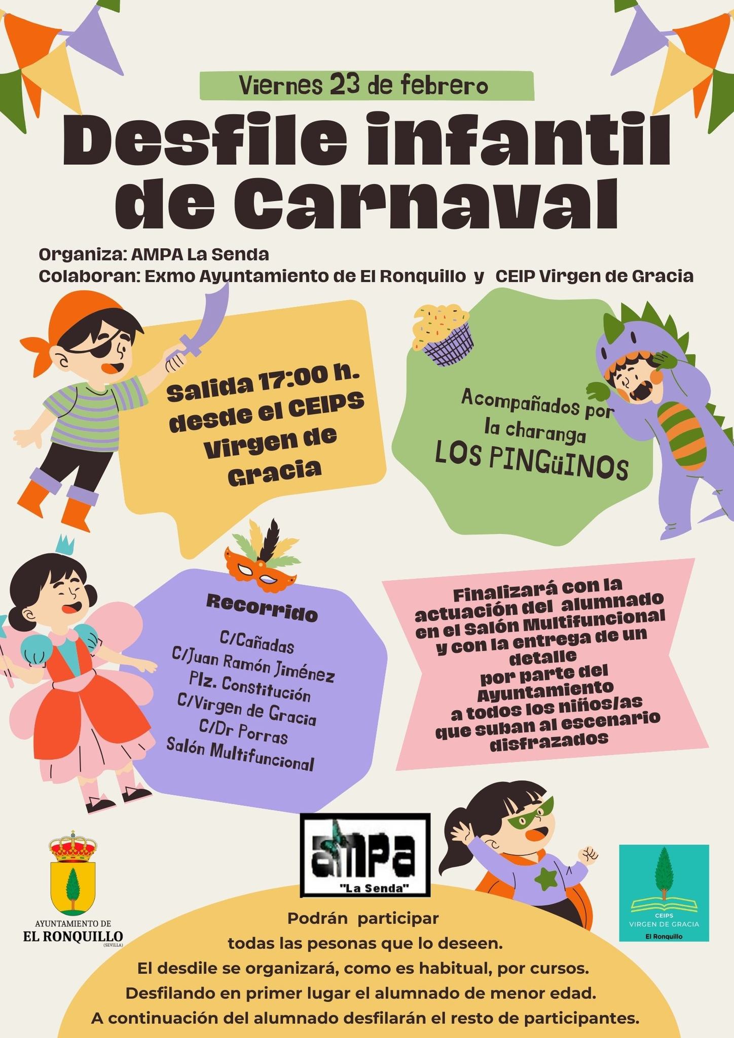 Este viernes, 23 de febrero, os esperamos a todos/as a las 17:00 h. en el Desfile Infantil de Carnaval. Este año el desfile viene con algunas novedades: volvemos a salir del colegio, como se hacía en los inicios de este desfile y se recorrerán las siguientes calles: