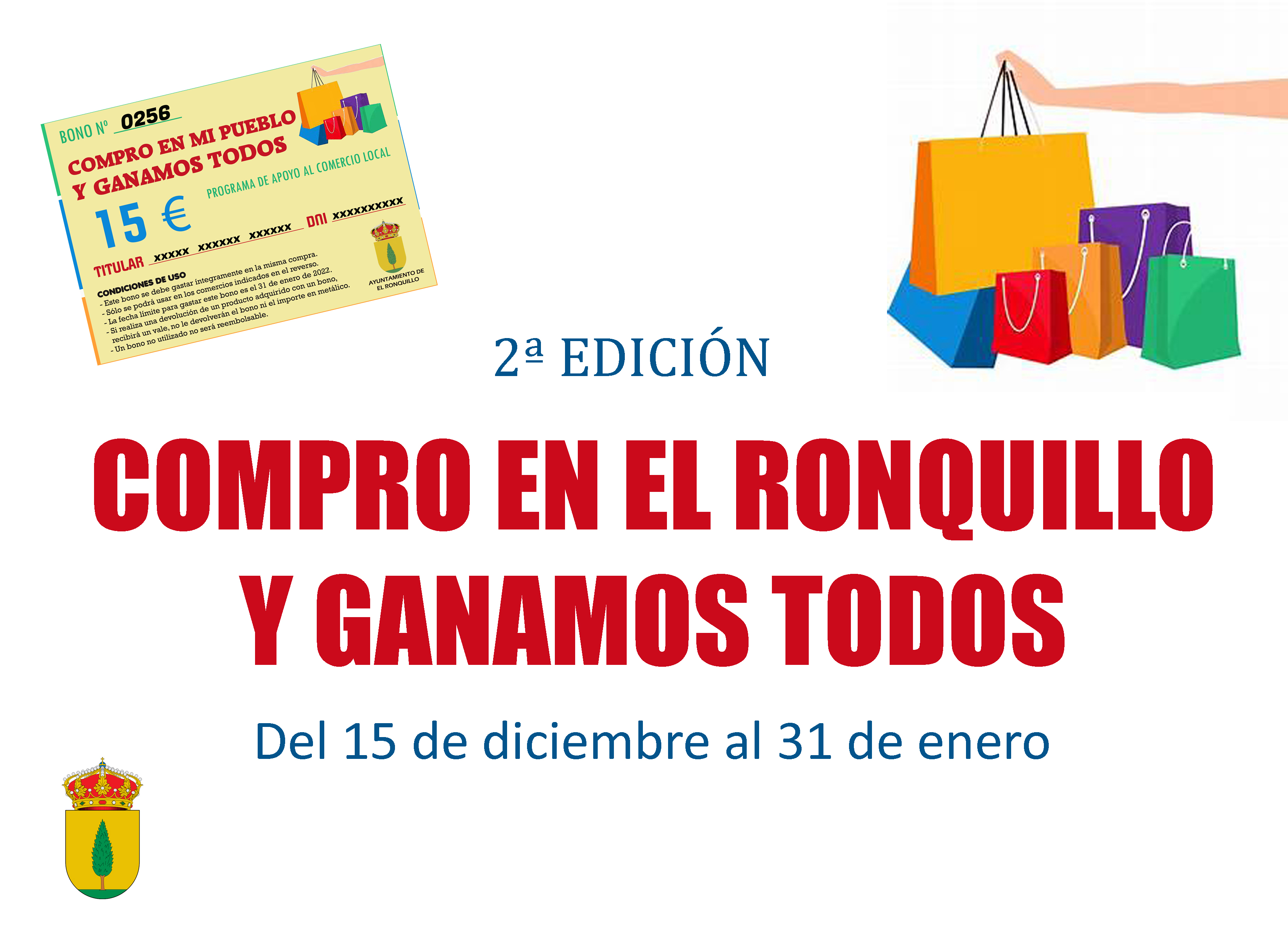 Recordamos a las empresas adheridas al programa "Compro en El Ronquillo y ganamos todos" que aún tengan en su poder bonos de dicho programa, que este Ayuntamiento solo podrá reembolsarles el importe de los bonos que se entreguen en el Ayuntamiento hasta el viernes 25 de febrero a las 14:00 h.