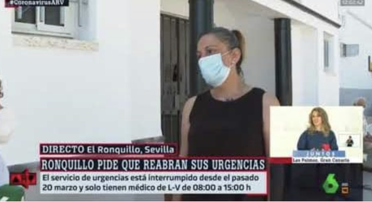 La teniente de alcalde de El Ronquillo, María Luisa Ros, ha sido entrevistada hoy, miércoles 5 de agosto de 2020, en directo para el Programa de La Sexta, Al Rojo Vivo, para exponer la problemática que supone para el municipio la supresión del servicio médico de urgencias, y reivindicar la reinstauración del mismo. Este servicio fue suprimido el pasado mes de marzo.