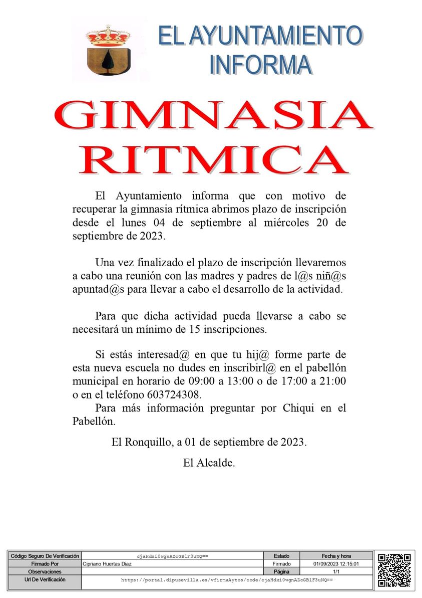 Si estás interesado/a que tu hijo/a forme parte de la nueva escuela de Gimnasia Rïtmica inscríbelo/a en el pabellón municipal hasta el miércoles 20 de septiembre.
