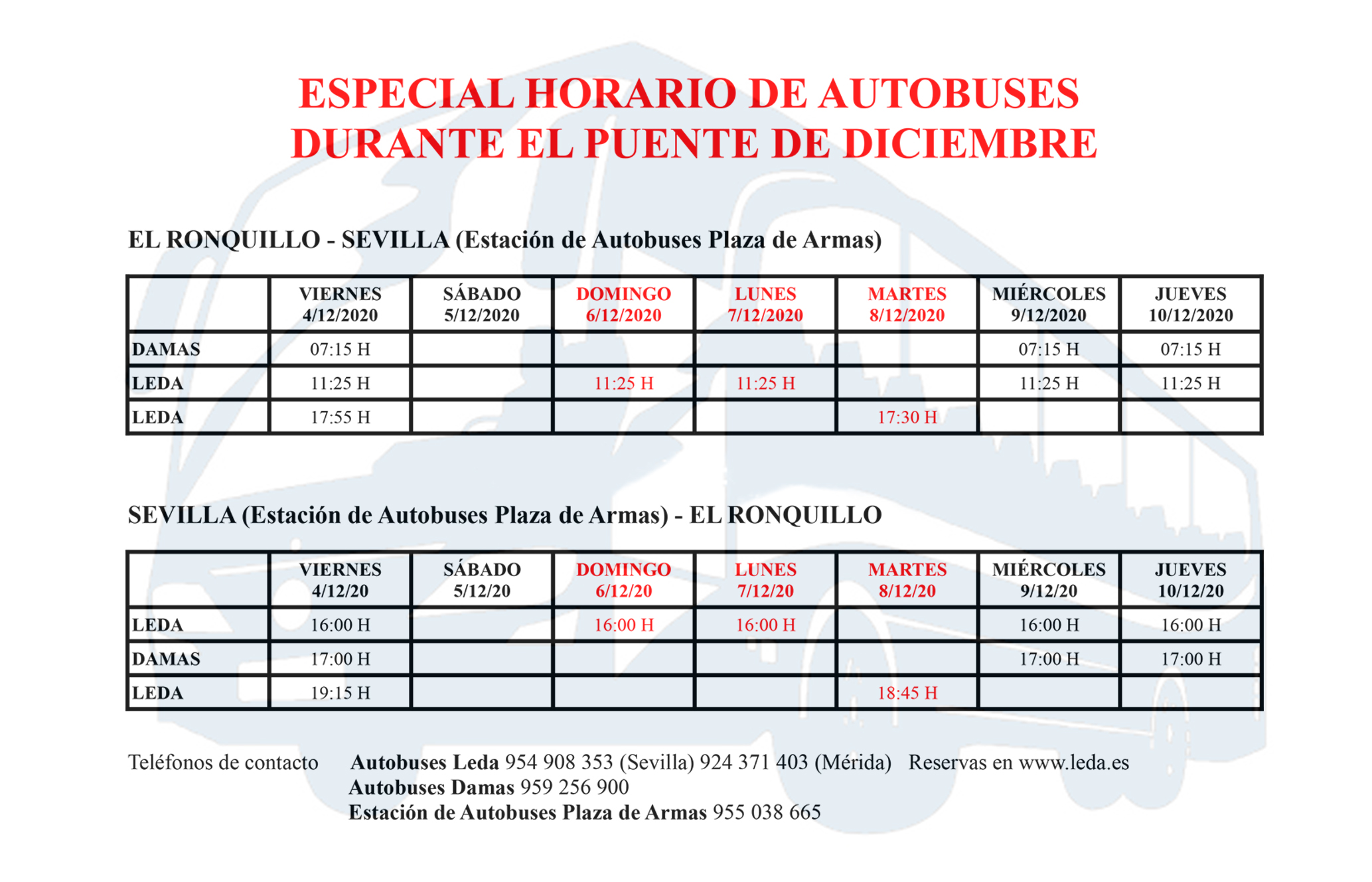 La Empresa de Autobuses Leda informa que con motivo del puente del próximo fin de semana los horarios de los autobuses serán los siguientes: