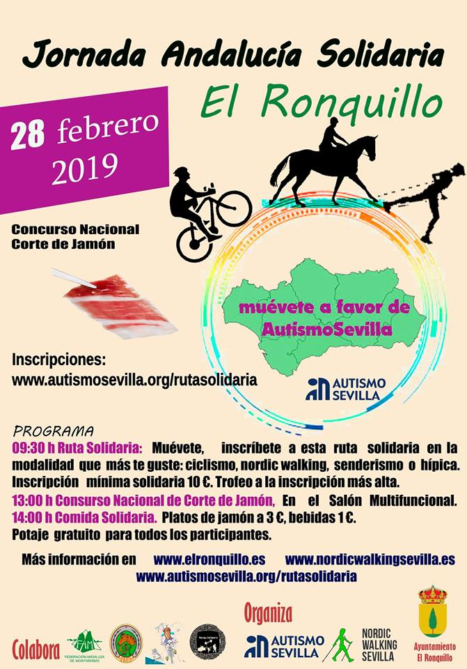 La “Jornada Andalucía Solidaria – El Ronquillo” consiste en la realización de un evento deportivo multidisciplinar (Senderismo, Marcha Nórdica, BTT e Hípica) con fines solidarios, sin ánimo de lucro. Es una prueba con carácter no competitivo, con varios recorridos, adaptados a las necesidades de cada participante:
