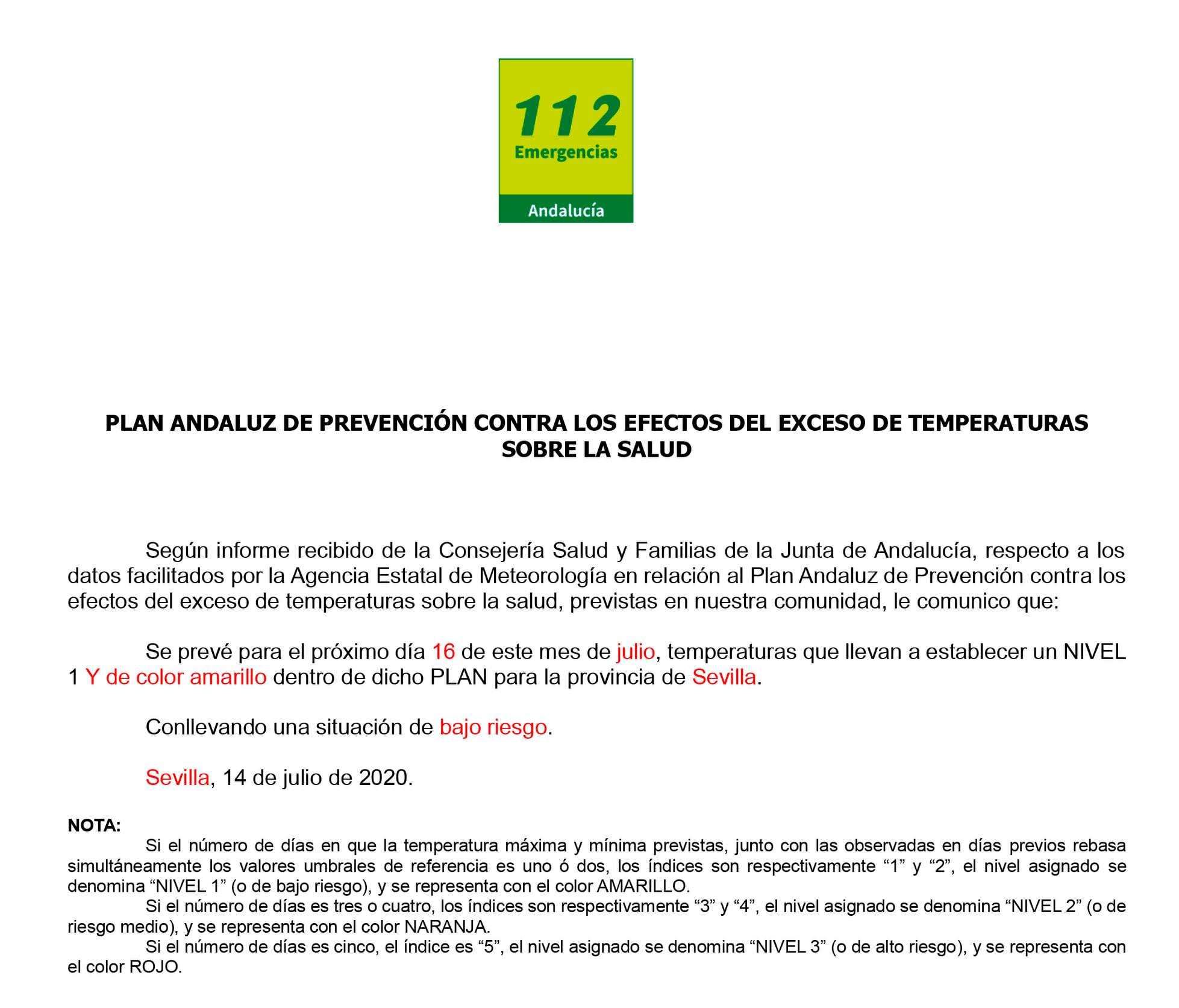 Se prevé para el próximo día 16 de este mes de julio, temperaturas que llevan a establecer un NIVEL 1 Y de color amarillo dentro de dicho PLAN para la provincia de Sevilla.