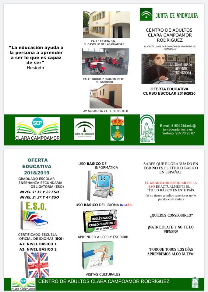 Ven al Ayuntamiento y reserva tu plaza en la Escuela de Adultos de El Ronquillo para el próximo curso.