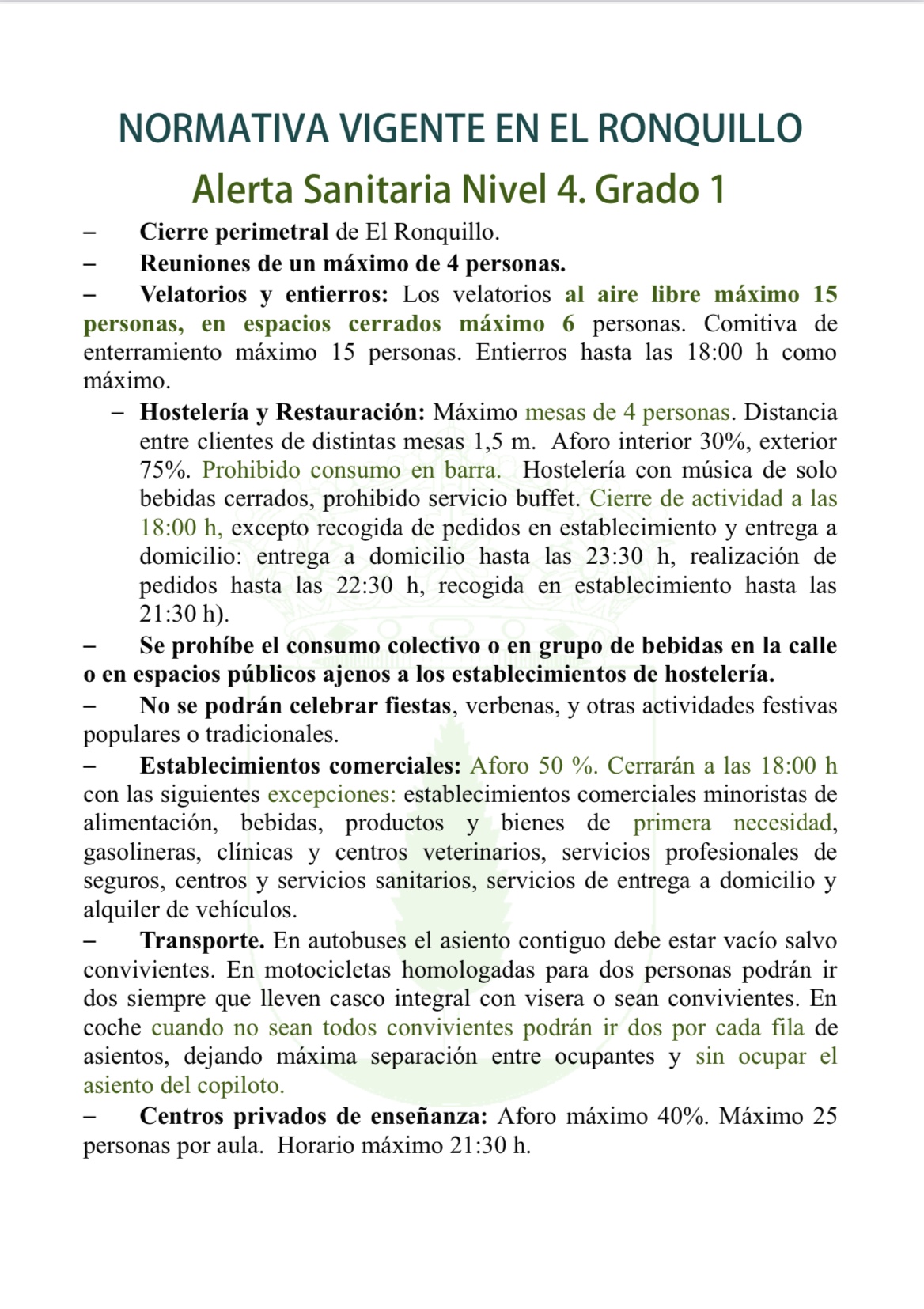 En el BOJA extraordinario de ayer declara a El Ronquillo en Nivel 4 Grado 1 de alerta sanitaria. Esta es la normativa vigente en los territorios con dicho nivel de alerta sanitaria.