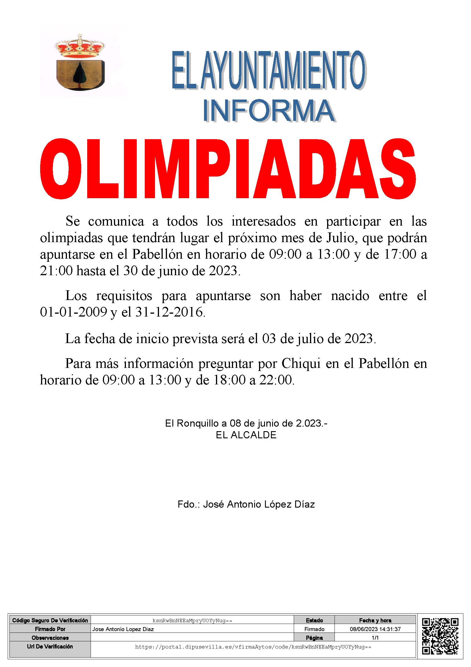 Inscripciones en el Pabellón de Deportes hasta el 30 de junio. Teléfono 603 724 308.