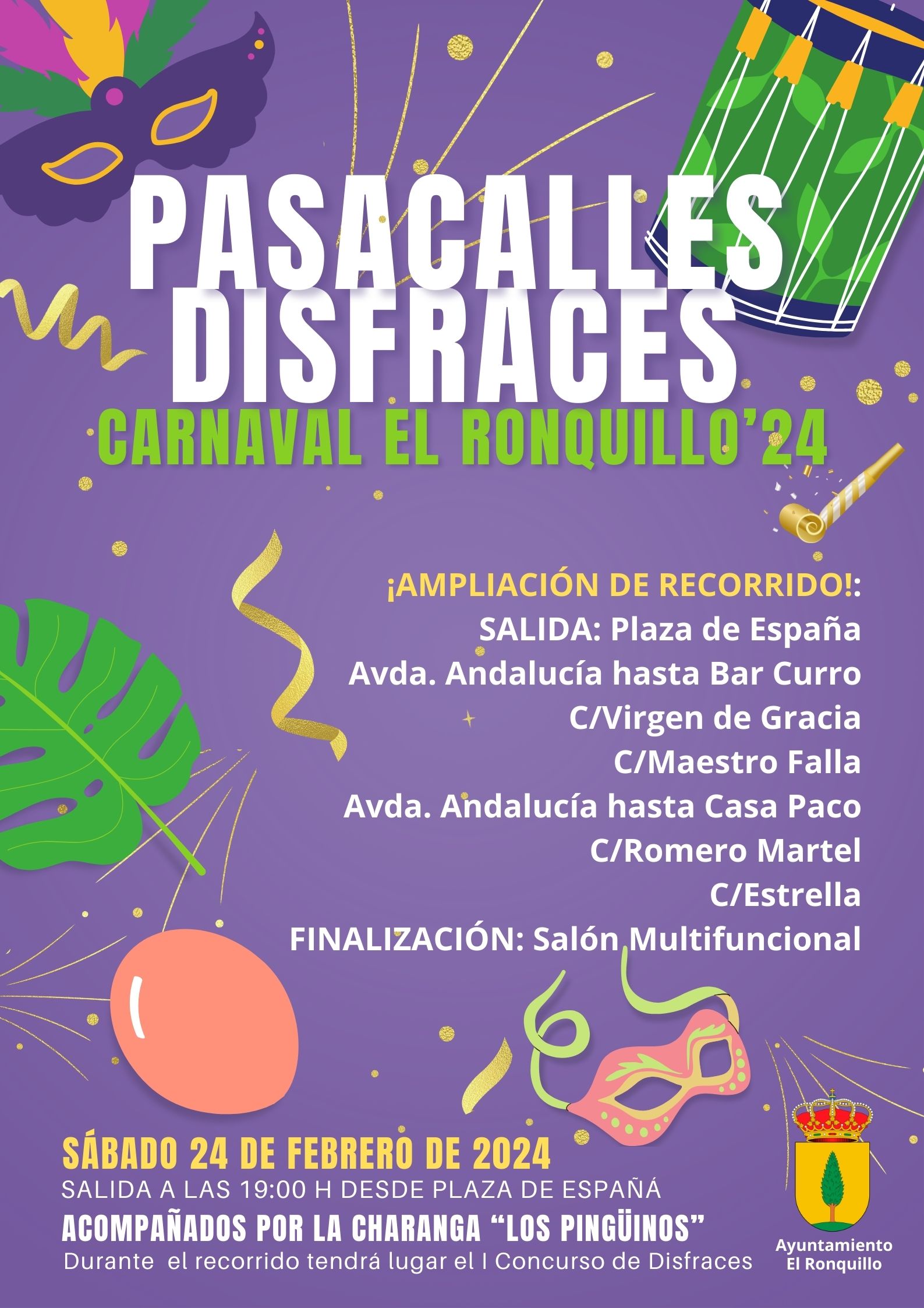Acompañados por la Charanga Los Pingüinos. Durante el recorrido tendrá lugar el Concurso de Disfraces de Carnaval (inscripciones hasta el jueves 22 de febrero).