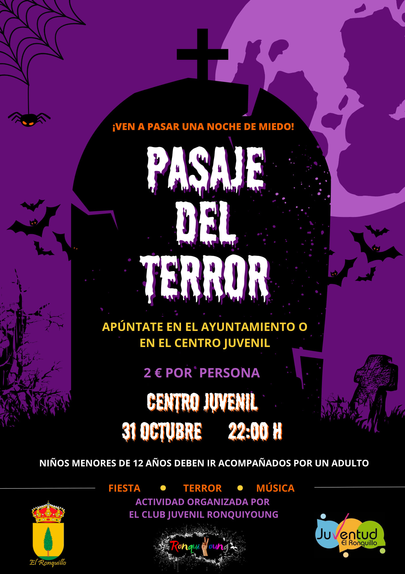 El nuevo club juvenil "Ronquiyoung" ha organizado, junto con el Área de juventud del Ayuntamiento, un pasaje del terror en el Centro Juvenil el próximo 31 de octubre a partir de las 22:00 h.