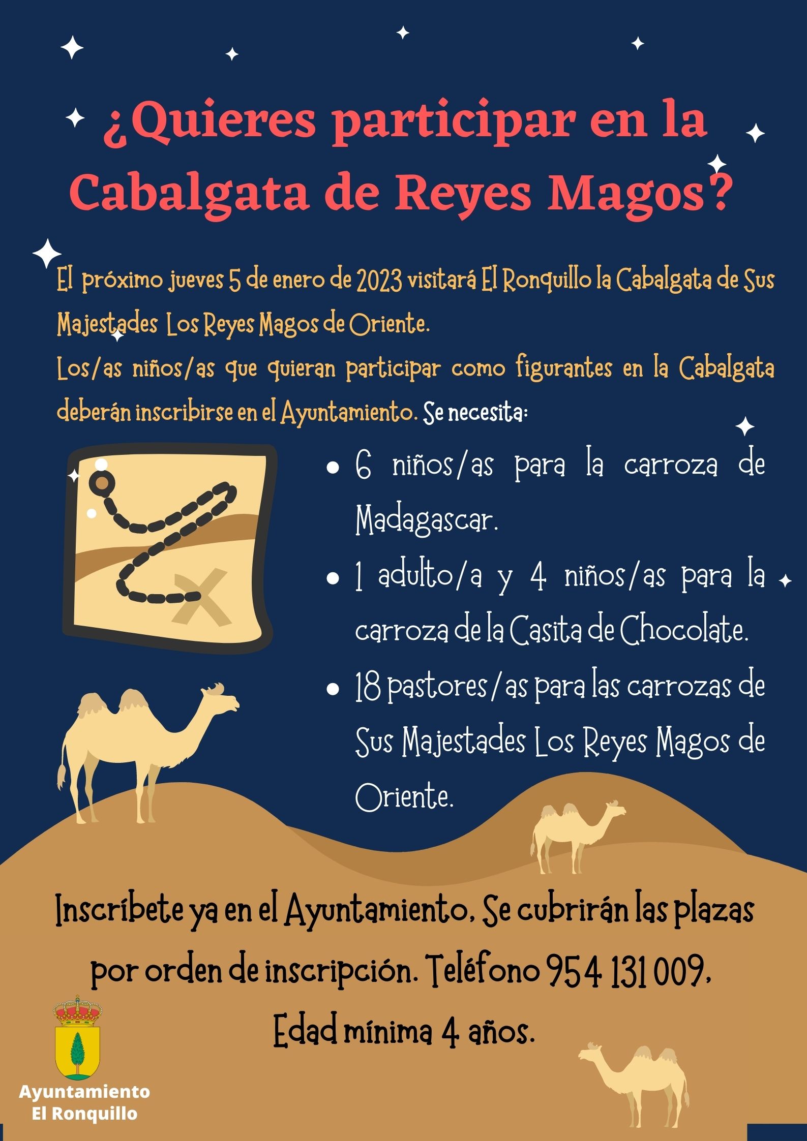 Se abren las inscripciones para participar como figurante en la Cabalgata de Reyes Magos 2023 de El Ronquillo. Se necesitan: