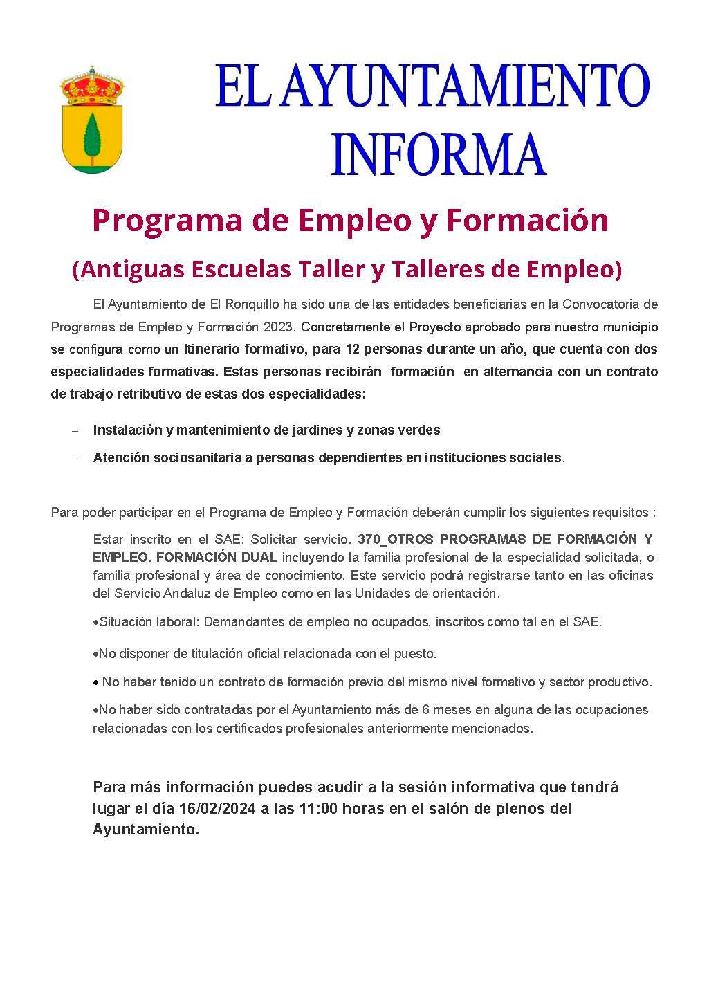 El Ayuntamiento de El Ronquillo ha sido beneficiario, en la Convocatoria de Programas de Empleo y Formación 2023, de un Itinerario formativo, para ̃. Estas personas ́ ́ . Especialidades:
