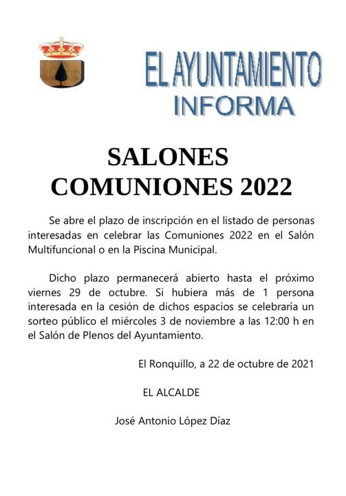 Si quieres solicitar el SALÓN MULTIFUNCIONAL o la zona de Bar de la PISCINA MUNICIPAL para la CELEBRACIÓN DE LAS COMUNIONES 2022, recuerda que te debes inscribir durante esta semana en el Ayuntamiento.