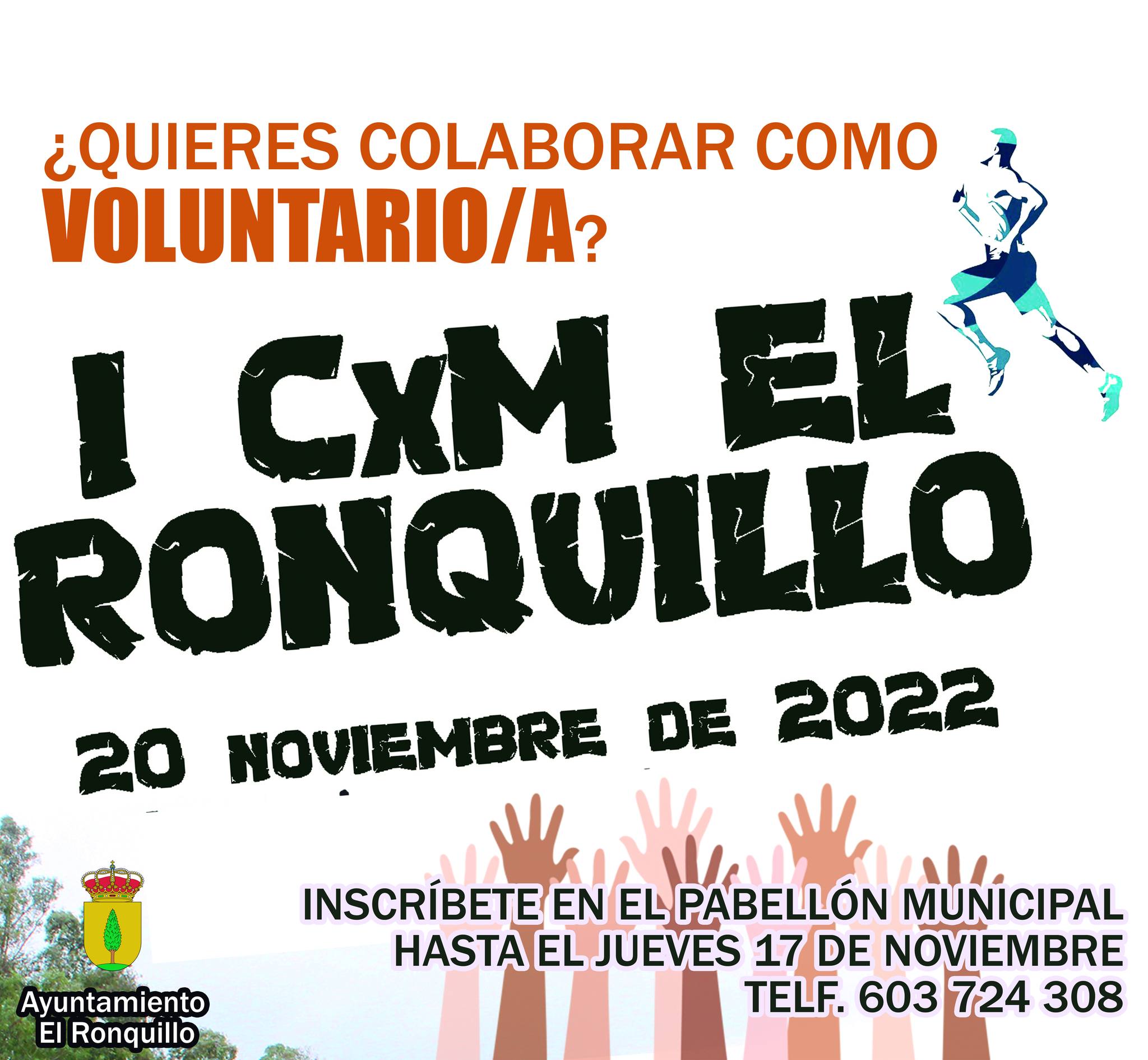 Si quieres ser voluntario/a en la I CxM El Ronquillo llama o acude al Pabellón de Deportes Municipal Raúl Cantillo Acemel antes del jueves 17 de noviembre e inscríbete.