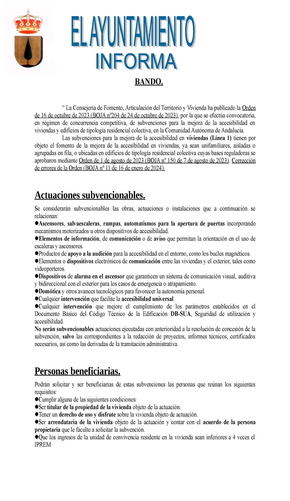 Las subvenciones para la mejora de la accesibilidad en viviendas (Línea 1) tienen por objeto el fomento de la mejora de la accesibilidad en viviendas, ya sean unifamiliares, aisladas o agrupadas en fila, o ubicadas en edificios de tipología residencial colectiva cuyas bases reguladoras se aprobaron mediante Orden de 1 de agosto de 2023 (BOJA nº 150 de 7 de agosto de 2023). Corrección de errores de la Orden (BOJA nº 11 de 16 de enero de 2024).