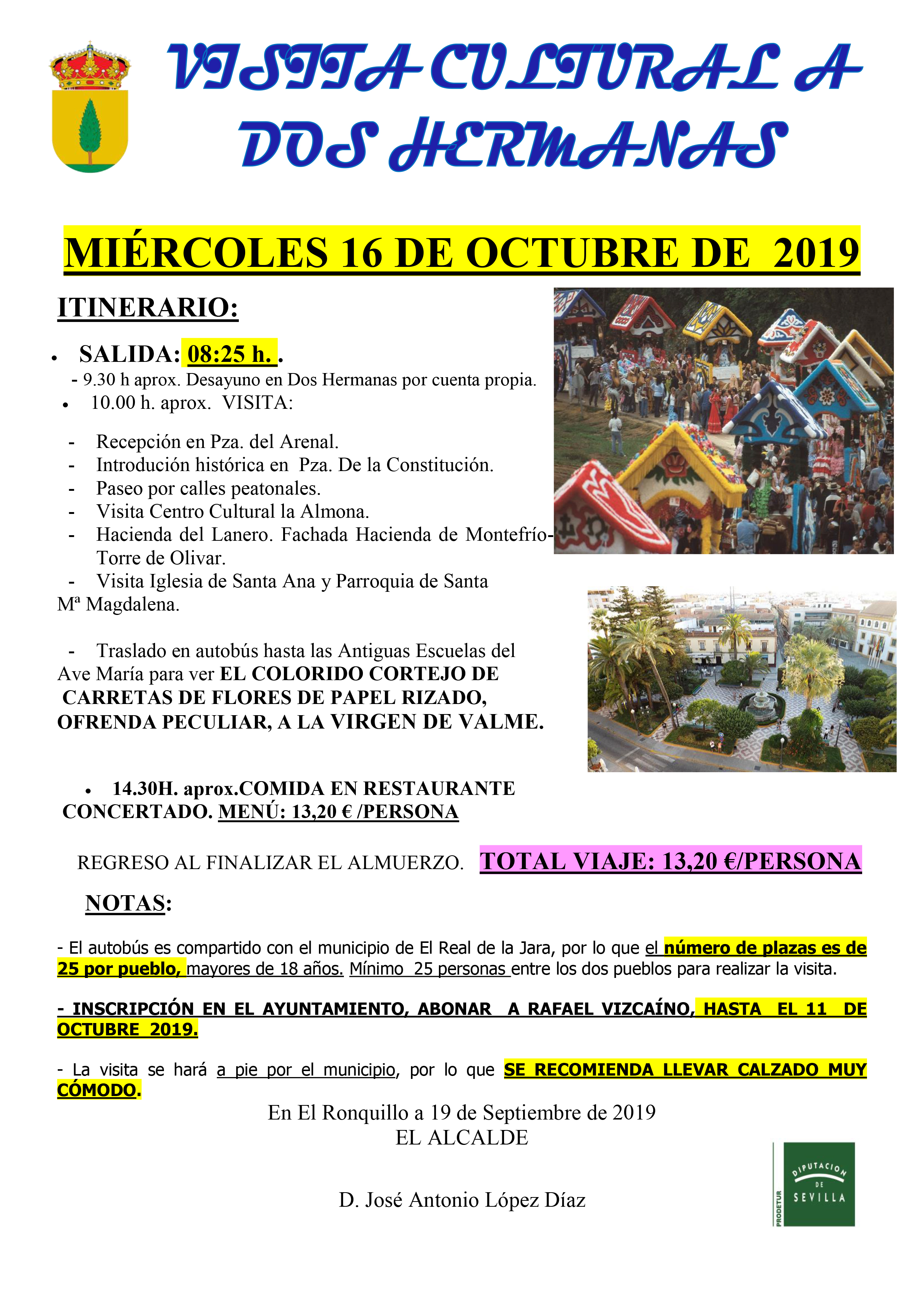 - El autobús es compartido con el municipio de El Real de la Jara, por lo que el número de plazas es de 25 por pueblo, mayores de 18 años. Mínimo 25 personas entre los dos pueblos para realizar la visita.