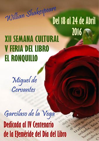Durante la semana del 18 al 24 de Abril de 20l6 El Ayuntamiento de El Ronquillo llevará a cabo, para la promoción de la cultura, la XII SEMANA CULTURAL Y LA V FERIA DEL LIBRO LOCAL, que este año celebra EL CUARTO CENTENARIO DE LA EFEMÉRIDE DEL DÍA DEL LIBRO que se relaciona directamente con la muerte de tres grandes autores: CERVANTES, GARCILASO DE LA VEGA Y SHAKESPEARE.