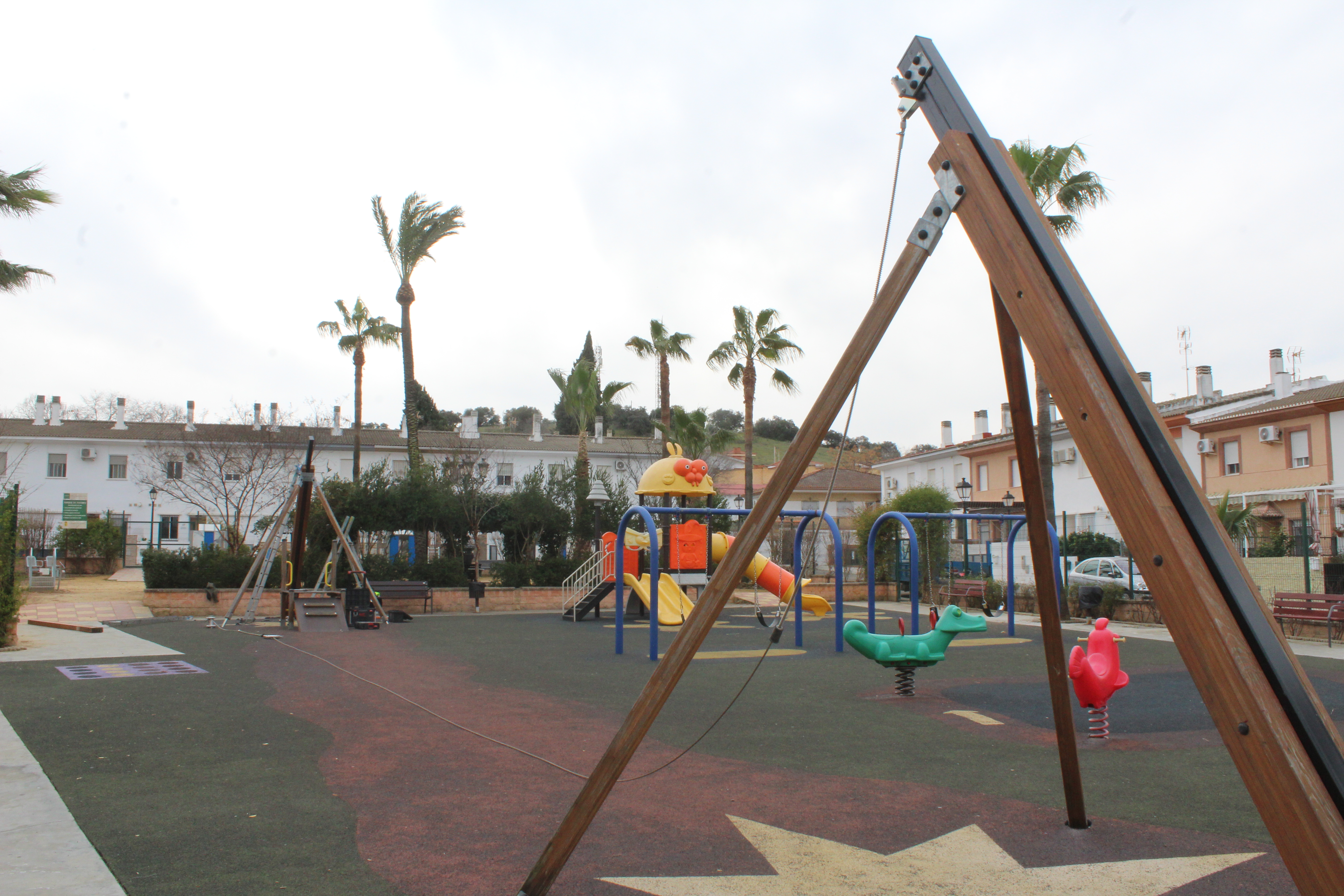 Una vez recibidos los materiales necesarios para la reparación de la tirolina del Parque Altozano comienzan los trabajos de reparación de la misma.